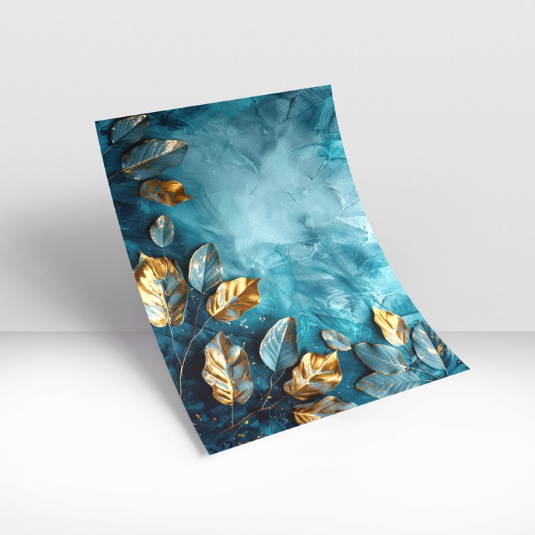 Elevate your interior with the refined beauty of this premium wall art featuring a captivating arrangement of gilded botanical leaves set against a rich teal abstract backdrop. The composition blends soft flowing textures with luminous golden accents, creating a sophisticated balance between nature and modern artistry. Each leaf appears delicately highlighted with gold tones, offering a striking contrast against the deep, layered hues of blue and teal that evoke tranquility and depth.