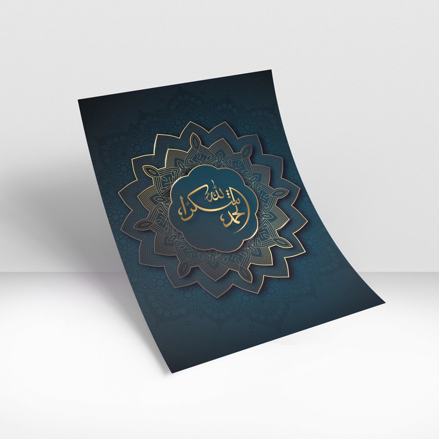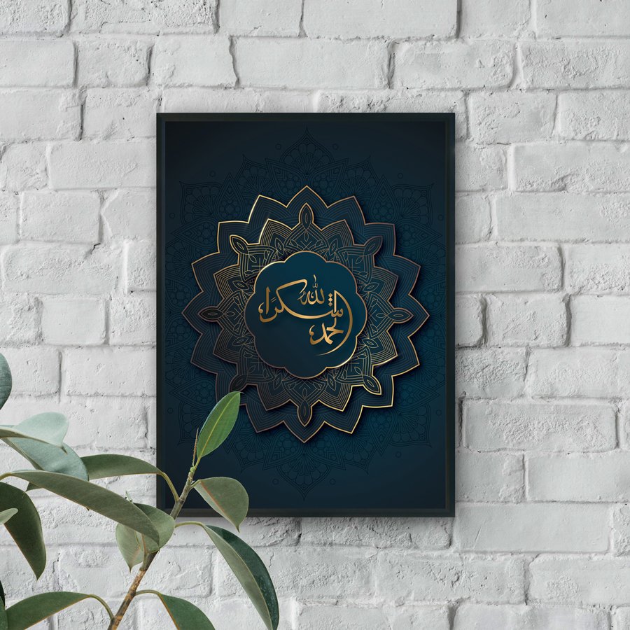 Gold Arabic calligraphy centered in ornate mandala design on deep teal Islamic wall art background