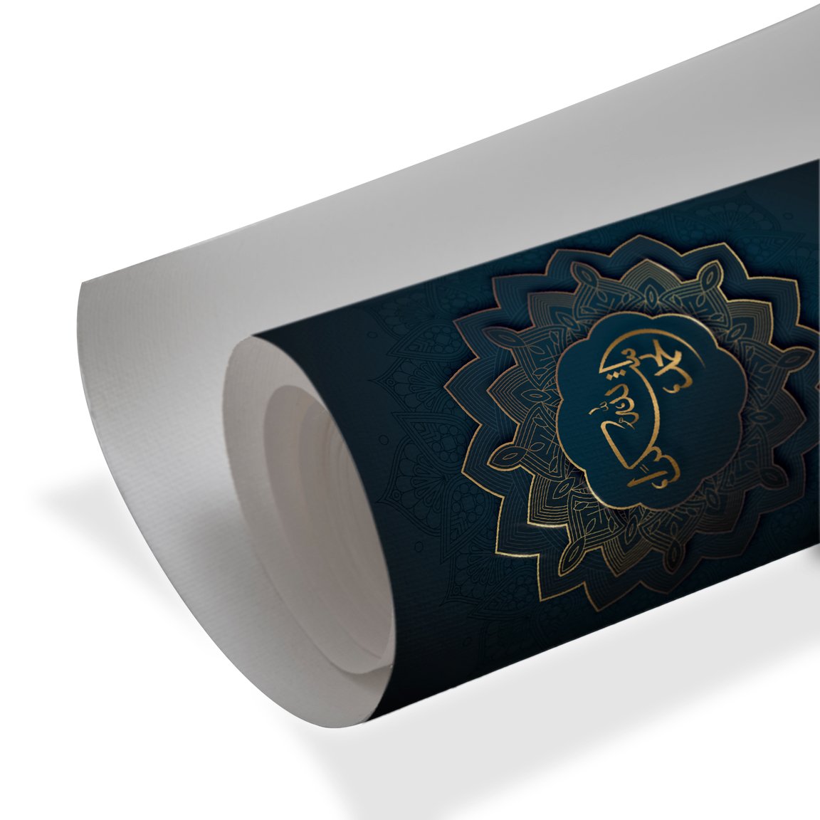 Introduce timeless elegance and spiritual beauty into your space with Divine Light, a luxurious Islamic calligraphy wall art piece designed with refined detail and depth. This artwork features graceful golden Arabic calligraphy centered within a layered floral medallion, set against a rich deep teal background.