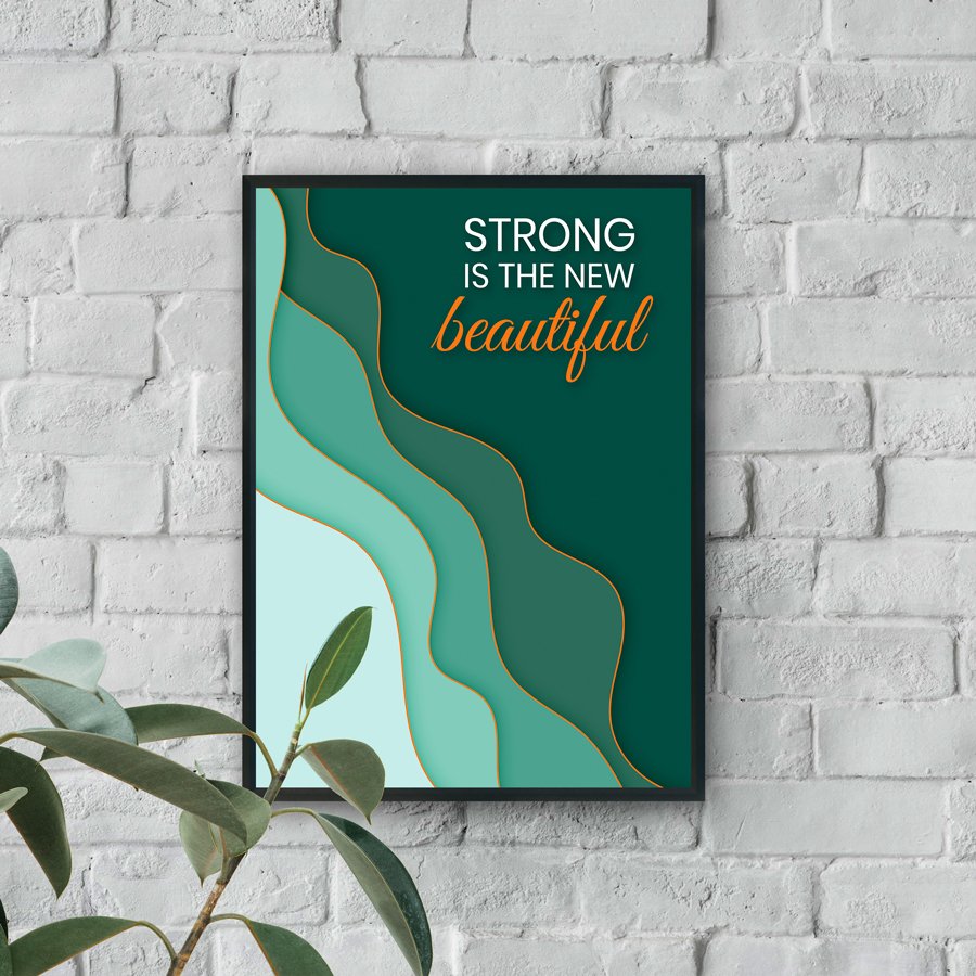 Make a bold statement with Emerald Strength, a modern motivational wall art piece designed to inspire confidence and empowerment. Featuring the powerful quote, “Strong is the new beautiful,” this design combines contemporary typography with flowing abstract layers in rich emerald and soft teal tones.