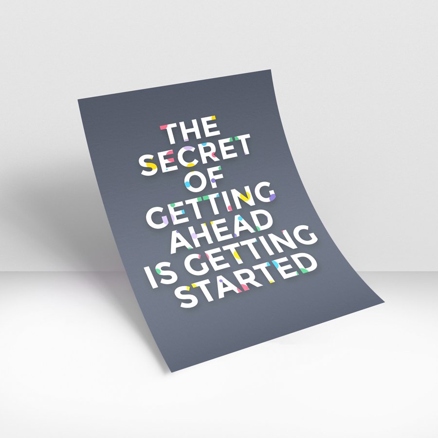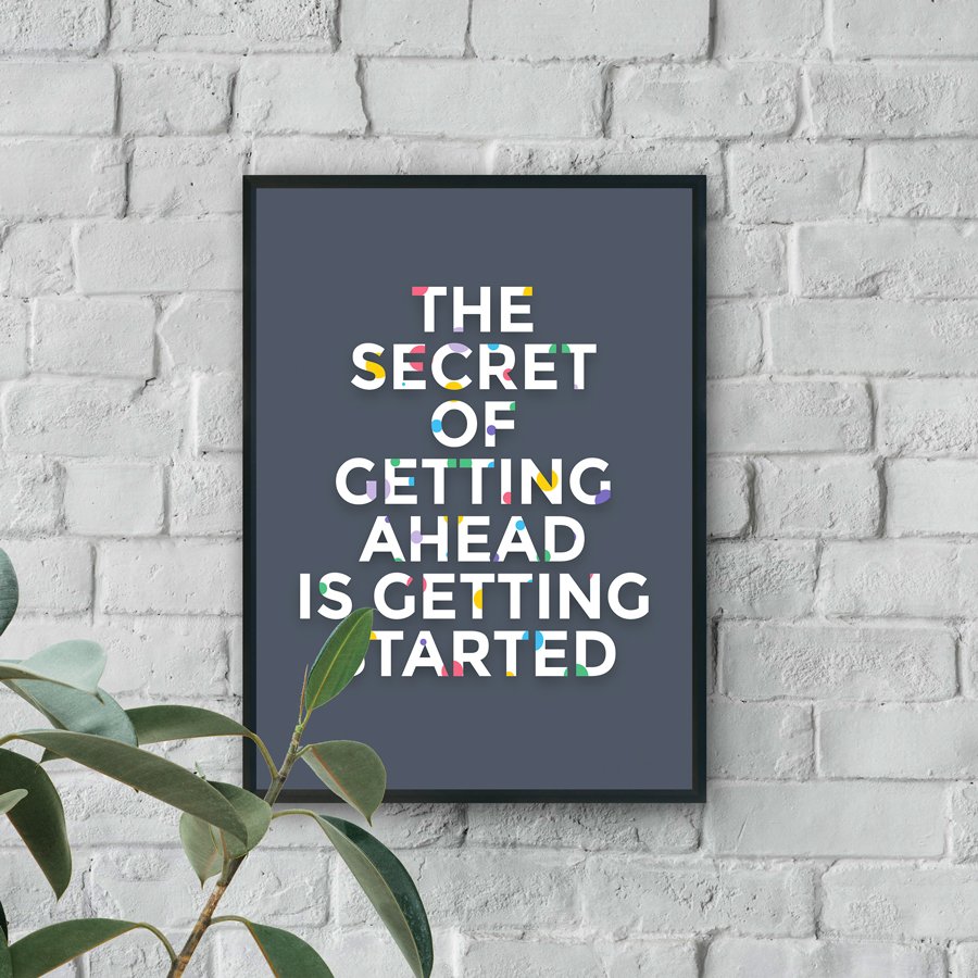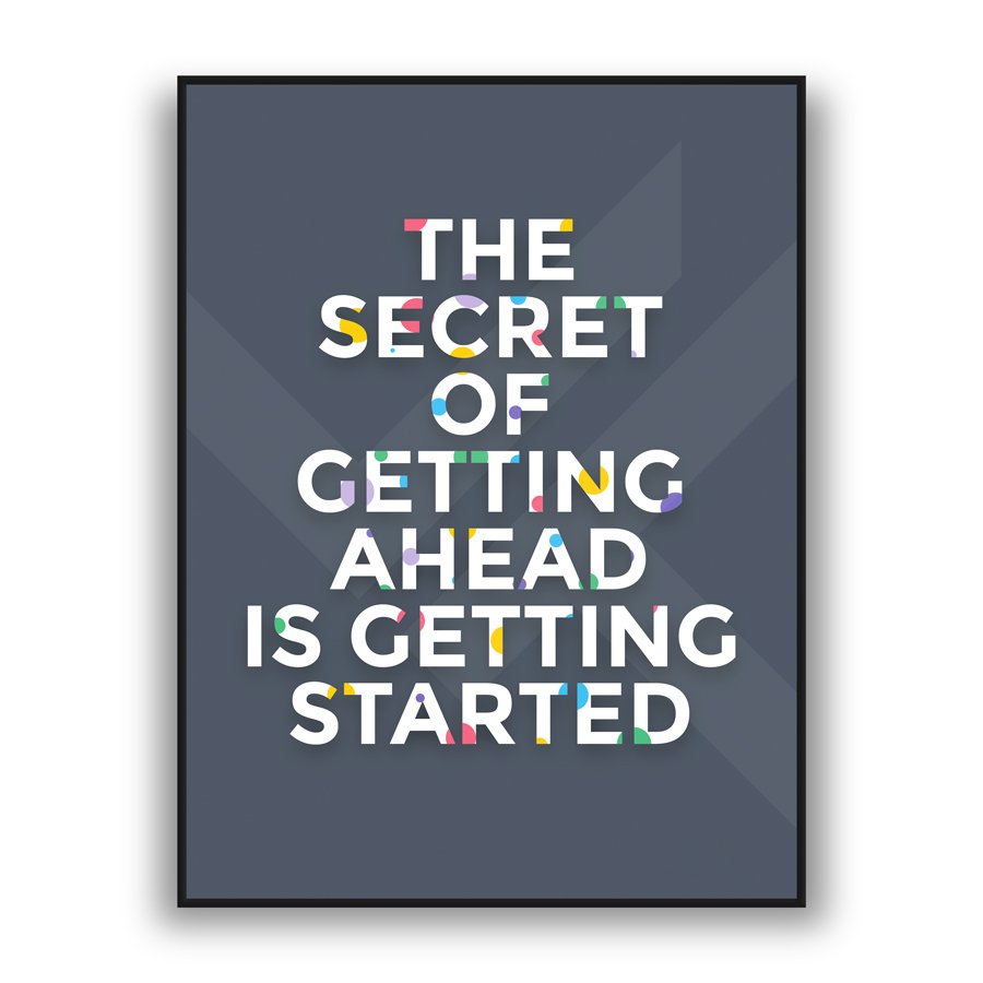 Momentum Principle is a refined expression of ambition, clarity, and forward movement. This premium wall art features the empowering statement, “The Secret of Getting Ahead Is Getting Started,” presented in bold, structured typography against a deep charcoal backdrop. Subtle pops of vibrant color woven into the lettering introduce a contemporary design element that elevates the entire composition.
