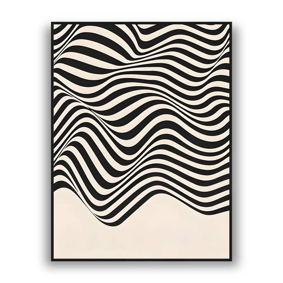 Featuring smooth, flowing black and ivory wave patterns, this artwork creates a dynamic sense of motion while maintaining a clean, modern aesthetic. The layered curves and rhythmic lines draw the eye across the canvas, adding depth and visual intrigue without overwhelming the space. The lower neutral section provides balance, enhancing its refined and contemporary feel.