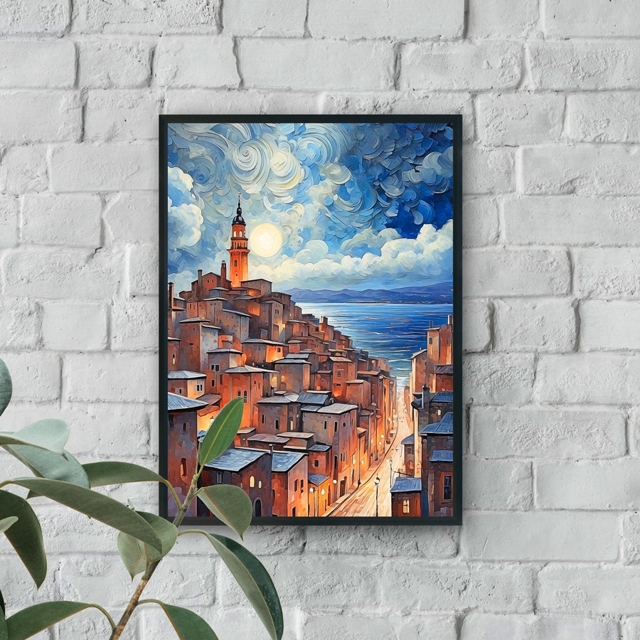 Step into a dreamlike evening with Moonlit Harbor, a captivating wall art piece that blends romantic architecture with a swirling, star-filled sky. Inspired by expressive brushstrokes and luminous night scenes, this artwork portrays a charming coastal village bathed in warm golden light beneath a glowing full moon.