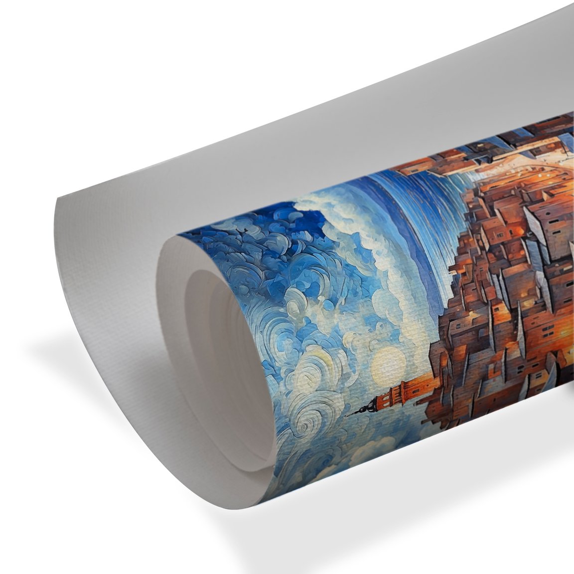 Terracotta rooftops and softly illuminated windows create a welcoming contrast against the rich blues of the sea and sky. The winding street leads the eye through the heart of the village toward the calm waterfront, while dramatic, swirling clouds add movement and emotion to the scene. The combination of warm and cool tones gives the artwork depth, vibrancy, and a timeless artistic appeal.