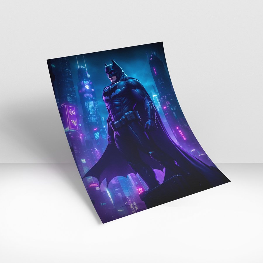 This dynamic artwork features a dark, armored hero standing tall above a neon-lit metropolis. Towering skyscrapers glow in vibrant shades of blue, purple, and magenta, casting dramatic light across the hero’s suit and flowing cape. The intense atmosphere blends strength, mystery, and modern sci-fi aesthetics into one striking visual statement.