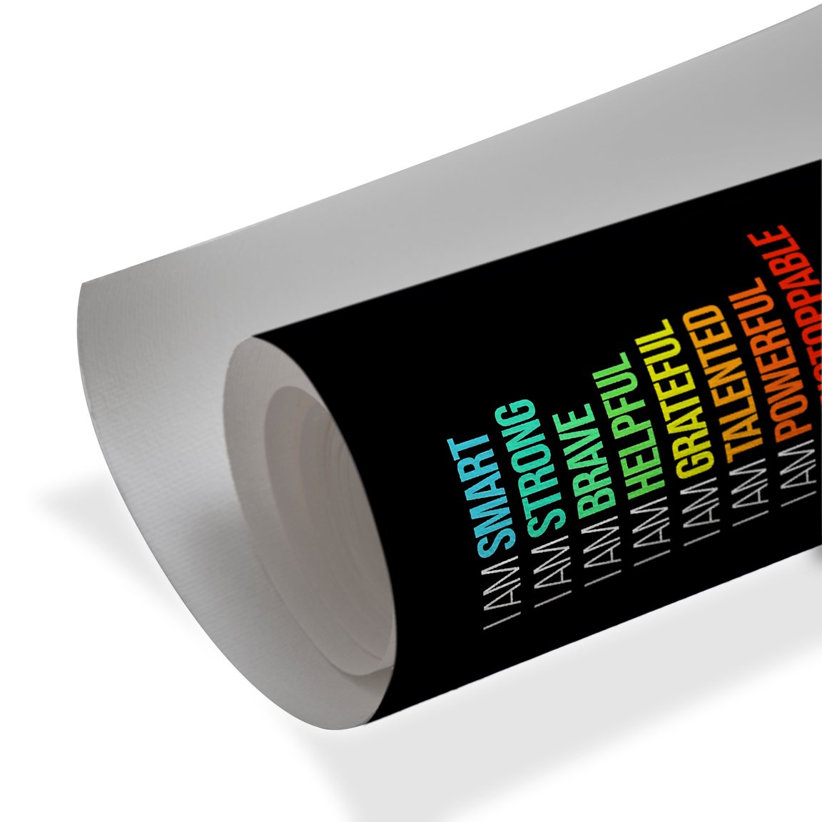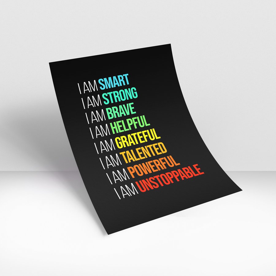 Set against a sleek black background, this striking typographic design features a powerful sequence of affirmations in a vibrant gradient of colors—from cool blues and greens to energetic yellows, oranges, and reds. Each line builds momentum: