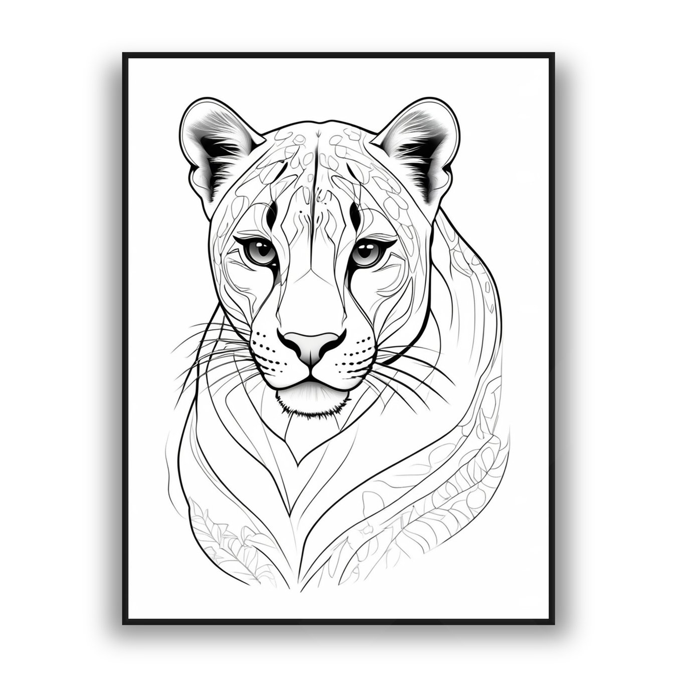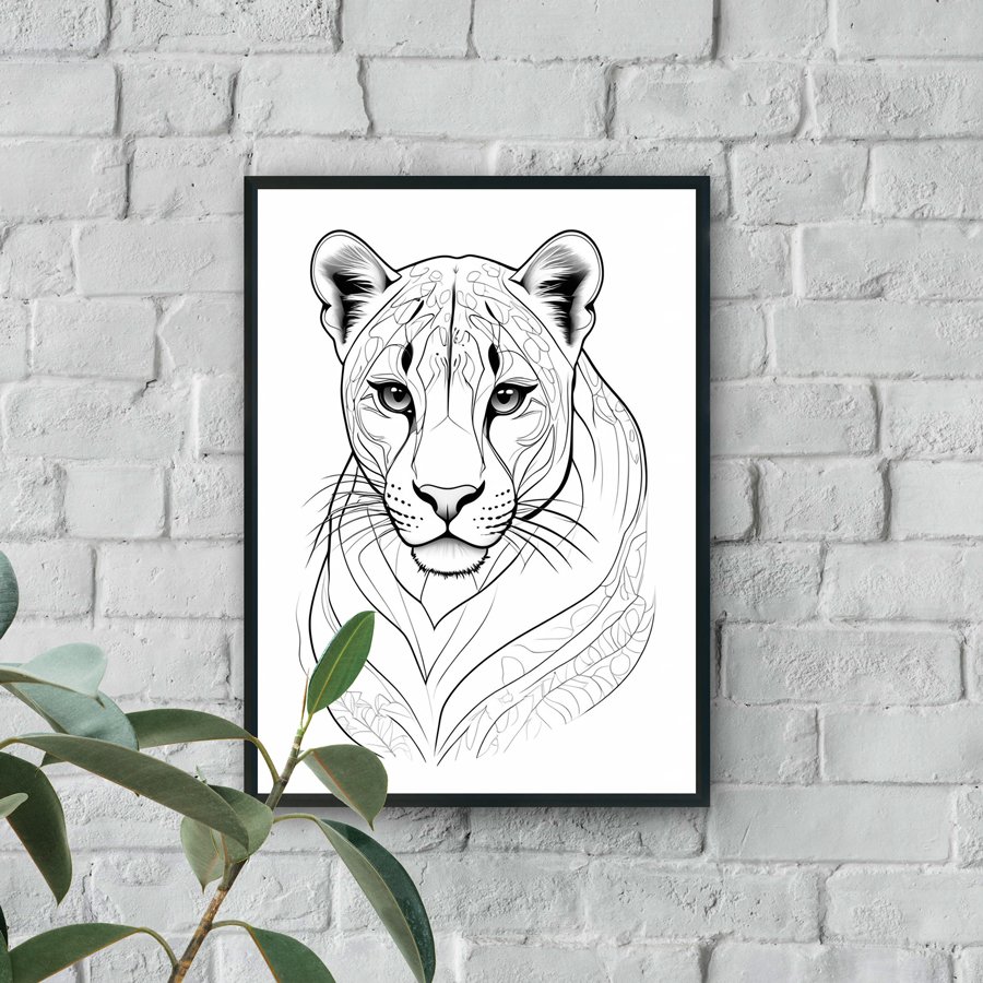 Celebrate quiet strength and refined beauty with Wild Grace, a minimalist lioness line art piece that captures elegance through simplicity. This striking black-and-white illustration features a front-facing lioness rendered in clean, flowing lines with delicate ornamental patterns subtly integrated into her fur.