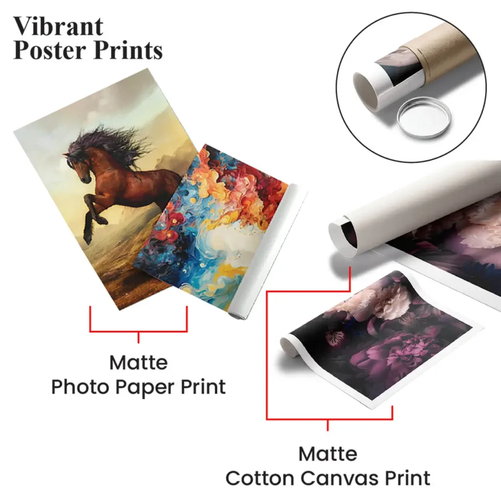 Our Vibrant Poster Prints are crafted using premium matte photo paper, matte cotton canvas, or matte vinyl, ensuring rich colors and fine detail. Each print is delivered in secure rolled packaging, carefully protected to avoid damage during transit.